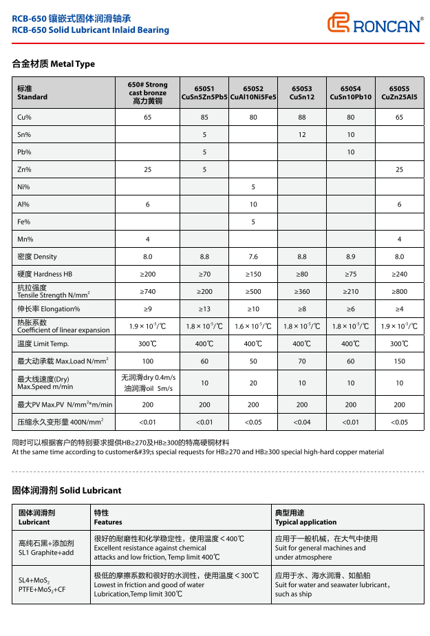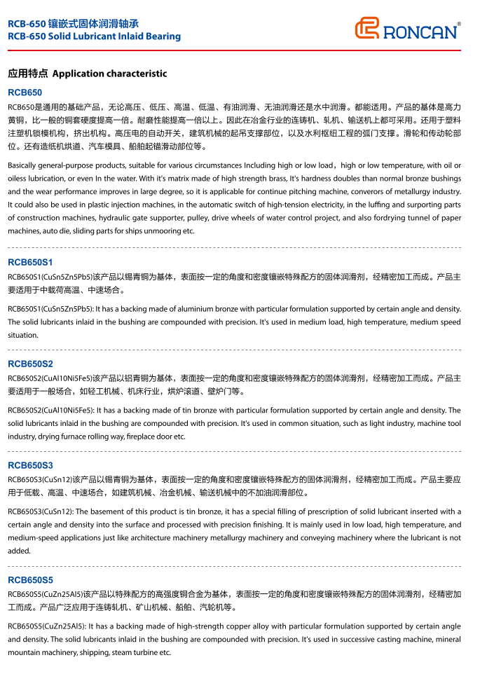 RCB650是通用的基礎(chǔ)產(chǎn)品,無論高壓、低壓、高溫、低溫、有油潤滑、無油潤滑還是水中潤滑。都能適用。產(chǎn)品的基體是高力黃銅,比一般的銅套硬度提高一倍。耐磨性能提高一倍以上。因此在冶金行業(yè)的連鑄機、軋機、輸送機上都可采用。還用于塑料注塑機鎖模機構(gòu),擠出機構(gòu)。高壓電的自動開關(guān),建筑機械的起吊支撐部位,以及水利樞紐工程的弧門支撐。滑輪和傳動輪部位。還有造紙機烘道、汽車模具、船舶起錨滑動部位等。